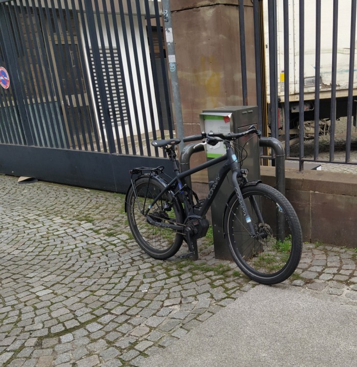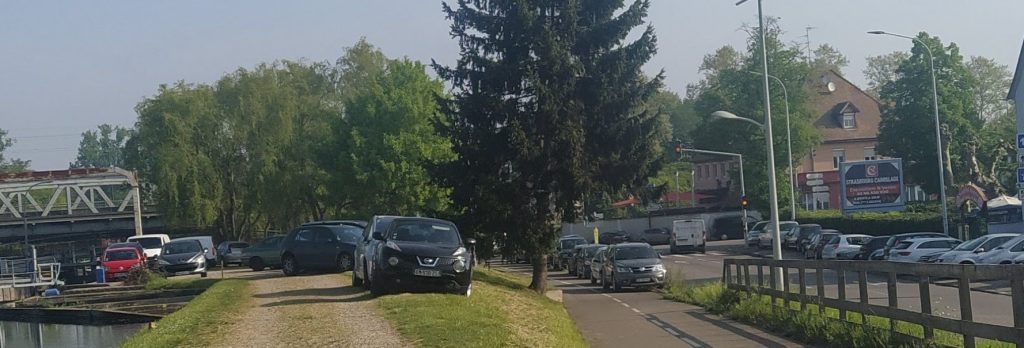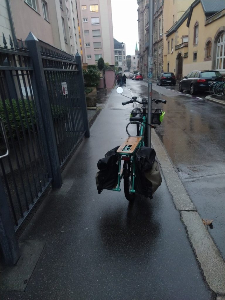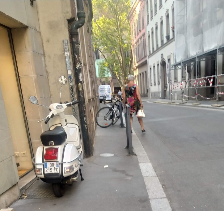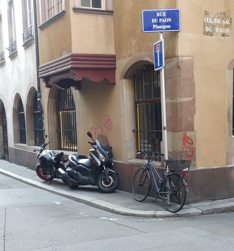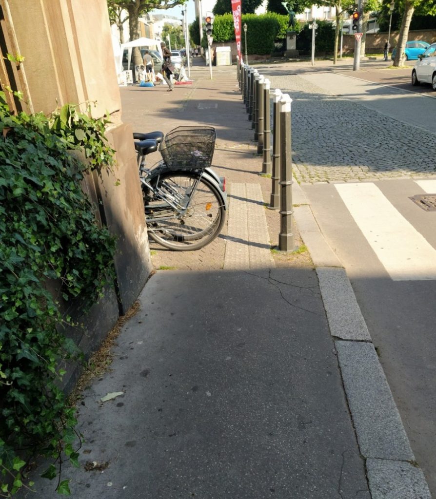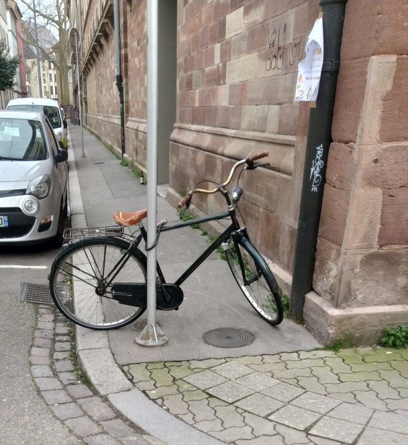 À l’origine, j’avais intitulé ce billet « Strasbourg et le stationnement des motorisés ». Mais en voyant un certain nombre de cyclistes stationnant n’importe comment, j’ai élargi le propos. Car si l’on critique une voiture garée sur le trottoir, un simple vélo placé perpendiculairement au trottoir ou le long d’une barrière peut lui aussi obliger un piéton à descendre sur la chaussée et pour une personne en fauteuil roulant « la gêne » est bien plus importante.
